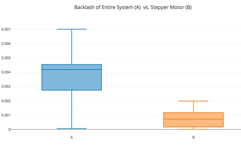 Backlash of entire system (A) vs. Stepper motor (B); dimensions of y-axis in radians