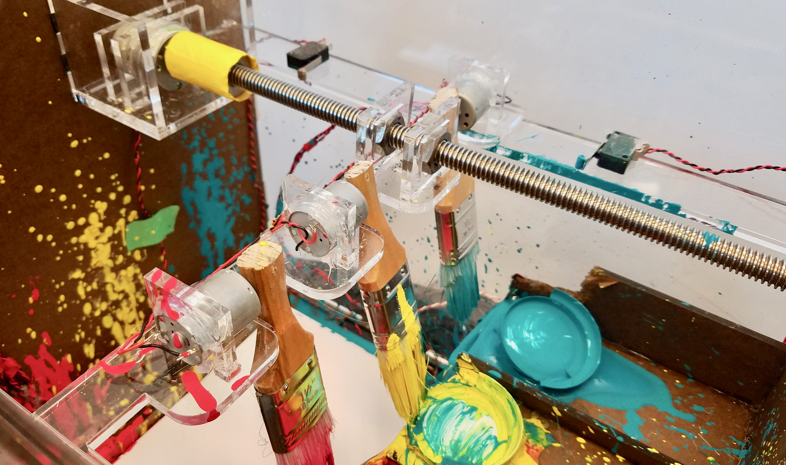 The painting was achieved by three paintbrushes of unique color, each individually actuated by a servomotor. These paintbrushes were fixed to a carousel driven by a stepper motor, allowing them to move along one axis. The user controlled this movement through the use of a joystick and actuated the paintbrushes by pressing corresponding buttons on the dashboard. After a set number of actuations the paintbrushes automatically moved to fixed paint trays to refill and then returned to their previous position. The user had 45 seconds to complete their painting as indicated by LED’s on the front of the painter.